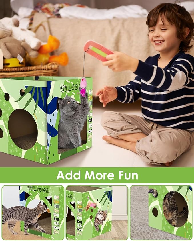- 【 Design Concept 】Cat cardboard house follows the nature of cats to hide and grind their claws, which designs a 2-1 upper and lower level cat vacation villa. Cat box is made of 100% recycled corrugated cardboard, non-toxic, providing a safe environment for your cat to rest and nap, and cat scratching board for exercise and play