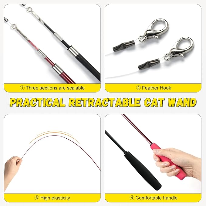 - Versatile Fun – Replaceable attachments (feathers/worms) work with other teaser toys. Compact storage when retracted