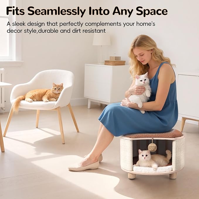 Solid Wood Cats House Stool, 300-lb Capacity. Large Cat Bed Cave for Indoor Cats & Humans. Cat Toy Ball, Removable Scratching Pad, Fleece Blanket. Suitable for Pets Under 20 lbs. 15.7"x15.7"x10.6"