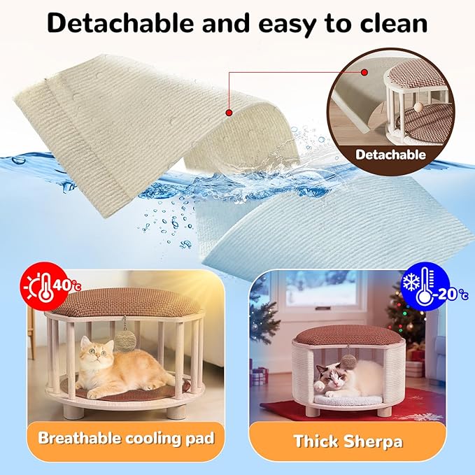 - 【Four Season Universal】: The two reversible cushions provide a lightweight and breathable felt in summer, and thick sherpa in winter to ensure your pet is comfortable all year round. The detachable thick cat scratch cloth provides ventilation and breathability in summer, and is fully wrapped for warmth in winter. The top is an ice silk cool cushion, which is cool and sweat free