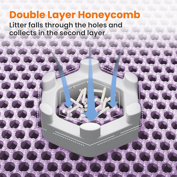 - Double-Layer Honeycomb Structure: The top layer features holes that capture all kinds of litter, allowing it to fall through to the waterproof bottom layer for easy cleanup. Simply pick up the kitty litter mat, pour the trapped litter back into the box, and reuse it—mess-free and effortless. This clever design minimizes litter waste and streamlines your daily cleaning routine.