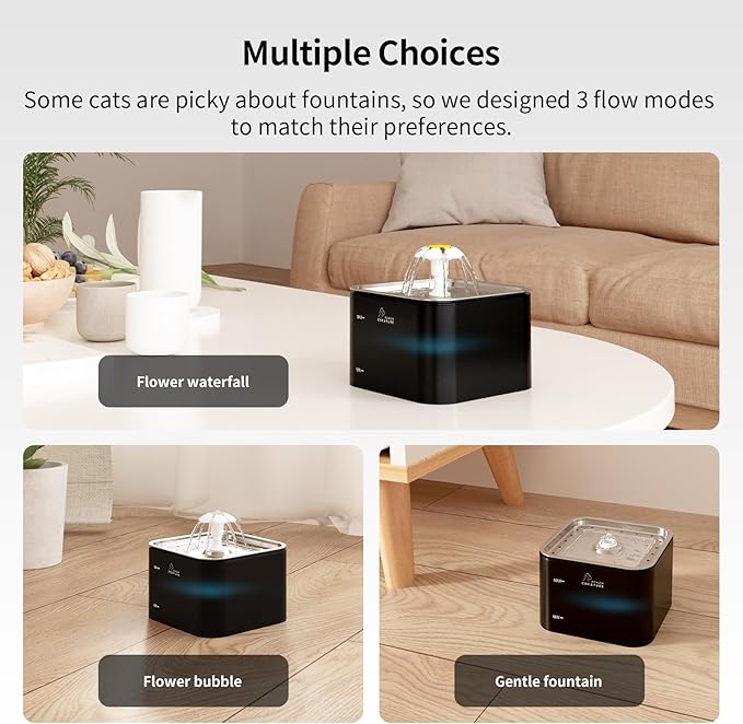 - [Encourages drinking with 3 modes]: 360° multi-directional streams aerate the water for added oxygen and freshness. A source of running water encourages pets to drink more rather than still water. Hydration helps prevent your pet from urinary and kidney diseases. This fountain has 3 different drinking modes. It provides more options for your pets and attracts them to drink more water.