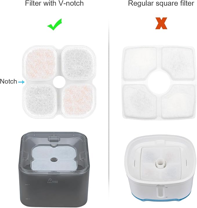 - [Circulating filtration system with 2 stages]: A replaceable charcoal filter removes dirt and food particles, and a pre-filter sponge designed to catch hair and debris. The round filter is composed of cotton layers, coconut shell activated carbons and ion-exchange resins. It provides fresh clean water to your lovely pets.