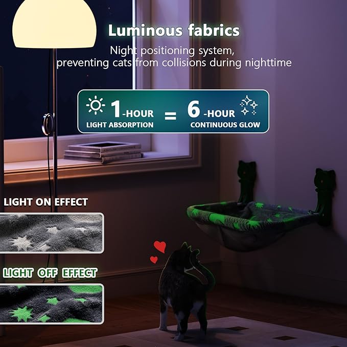 Cat Window Perch Cordless, Glow in The Dark & Stable Cat Beds- Breathable Window Hammock for Overlooking, Sunbathing and Climbing - Maximum Hold Up to 40lb(Grey)