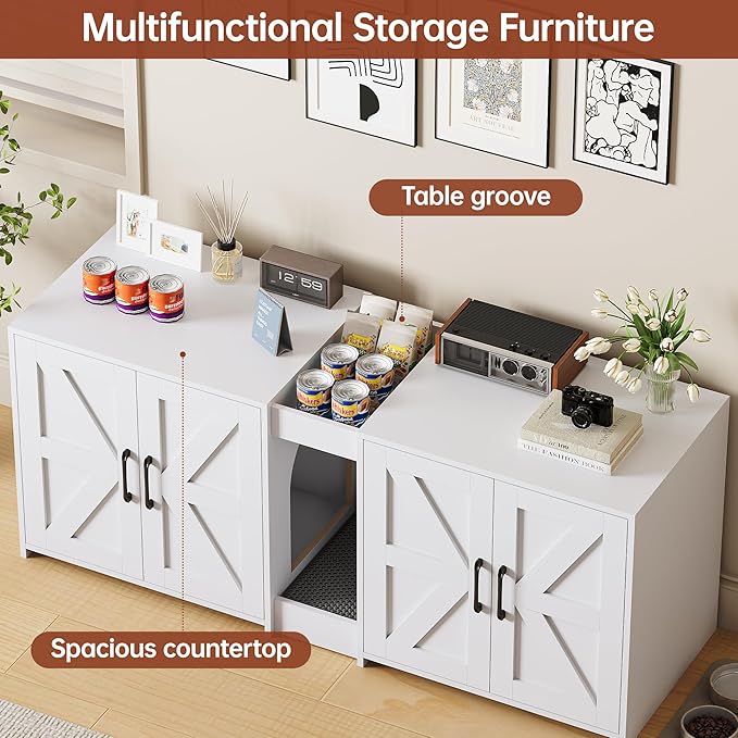 - 【Ample Storage Space】: This versatile cat litter cabinet is constructed from two cabinets measuring 22.6"L x 17.1"W x 19.9"H. Two central openings measuring 12.6"H x 11"W allow cats to move freely between the cabinets. The entire double litter cabinet measures 55"L x 17.7"W x 22.8"H, providing a spacious countertop for display and perfect for storing pet supplies and decorating your home.
