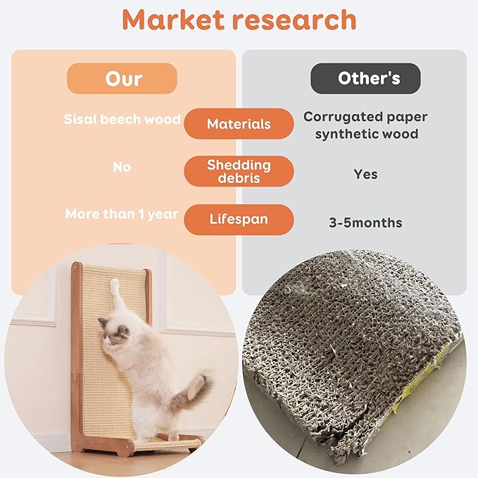 - 【Premium Durable Scratching Post with Natural Materials】Crafted with tightly woven 100% natural sisal fibers and a solid beechwood base, this L-shaped cat scratcher withstands even the most energetic clawing sessions. The nature materials ensure long-lasting durability compared to paper alternatives, making it a permanent furniture protector for cats' natural scratching instincts.