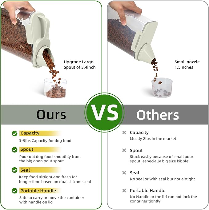 - BENEFITS : Upgraded Large Pour Spout with Measuring Cup-We upgraded the mold so that the pour spout is large enough to pour out large dog food.You can now pour food easily and quickly.The newly upgraded measuring cup can now also be easily screwed onto the nozzle