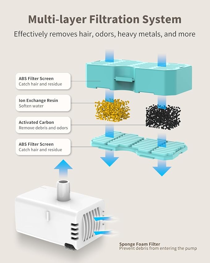 - 【Efficient Filtration System】The built-in multi-layer filtration system includes activated carbon, ion exchange resin, and high-density sponge. This effectively removes odors, softens water, and filters hair and debris, ensuring fresh and clean water every sip. For best results, replace filters every 2 weeks.