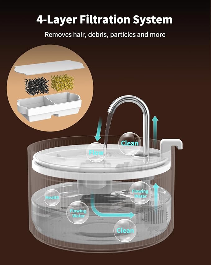 - [Triple Filtration System]: A sponge filter traps debris and pet hair, while an activated carbon filter reduces impurities and odors — keeping the water fresh and improving taste your pet will love.