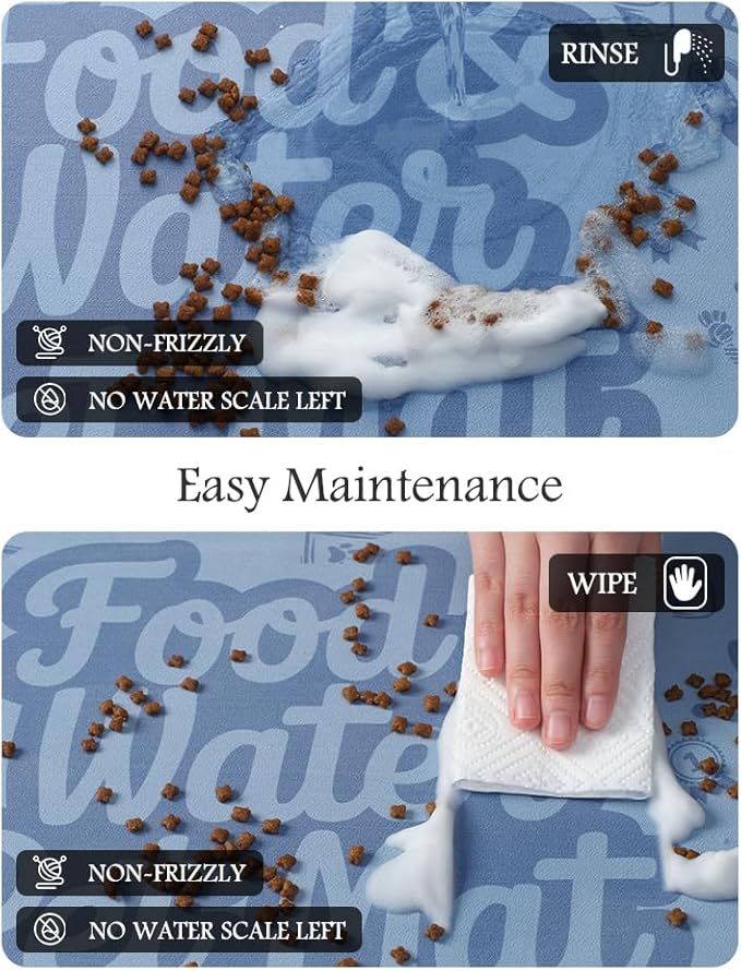 - Keep Clean & No Stains:No marks will be left when food and water are dropped on the dog food mat. Unlike traditional silicone pet feeding mats, our pet feeding mat for food and water won't pick up pet hair or dust, and won't build up tough-to-clean limescale, keeping the dog bowl mat as good as new forever.