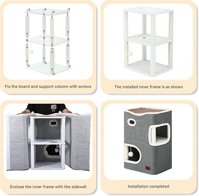 - Comfortable and Stable: The 2-story cat bed is made of high-density board to ensure a maximum load-bearing capacity of 35 pounds. Even the most playful felines can play and jump without compromising the integrity of the structure. MDF and posts are wrapped with plush around the holes for comfort