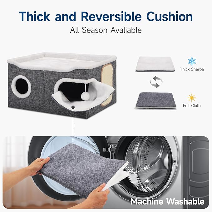 Cat Beds for Indoor Cats, Extra Wide Cat Cube House for Multi Cats, Foldable Cat Cave Hideaway with Arc-Edge Design & Oval Door, Double-Side Soft Cushion for All Seasons, 24"L x 17.7"D x 12.6"H, Grey