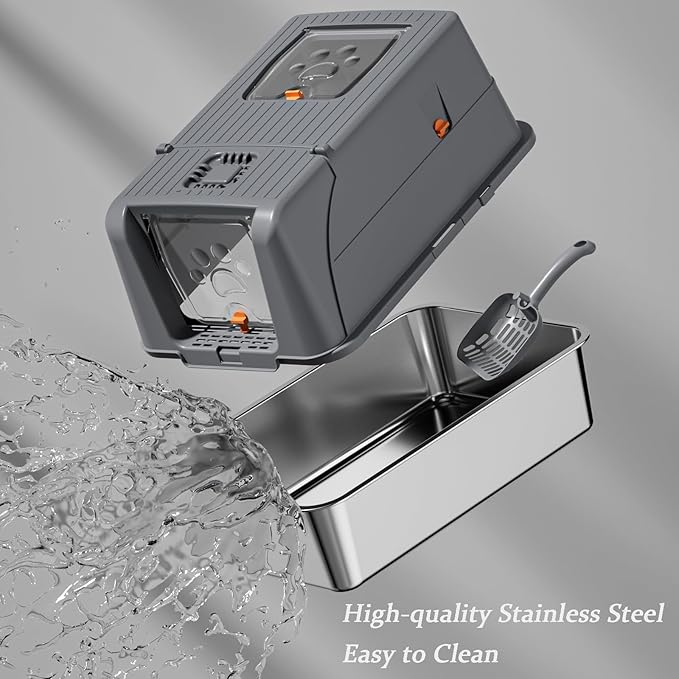 - 【High Quality Enclosed Litter Box】The bottom basin of this metal litter box is made of high-quality thickened 201 stainless steel material, which is sturdy and durable, with a smooth and non stick surface, and easy to clean. The middle part and upper cover are made of thickened high-quality ABS plastic, which is not deformed, sturdy and durable.