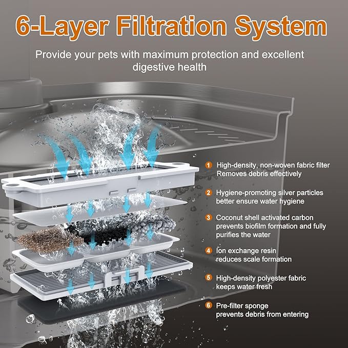 - 【6-Stage Advanced Filtration – Extra Protection for Your Pet's Health】 The automatic cat water dispenser Filter (6 layers: high-density fabric, coconut carbon, ion resin, silver particles, polyester fiber, pre-filter sponge).Vet-recommended to promote hydration & prevent urinary issues