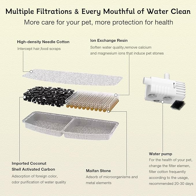 - 【Stainless Steel Water Tray to Improve Health】- Every drop of water is filtered through vertical filtration system to move all impurities and provide oxygen-enriched and better-tasting water. 1.Activated carb0n moves bad taste and 0dor 2.Ion exchange resin could soften the tap water 3.Medical stone moves heavy metals and releases trace elements 4.Non-woven fabric could filter hair and impurities 5.The high-density sponge of pump helps move fine particles