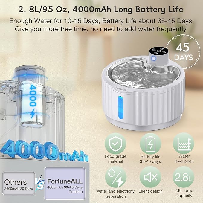 - 【Superb Battery Life】- With a built-in 4000mAh rechargeable battery, the FortuneALL cordless cat fountain provides up to 35-45 days of fresh and clean water to your pets. Rest assured even during power outages or short trips. Even if you go out to work, take a short trip or come home late, your pet will not be thirsty