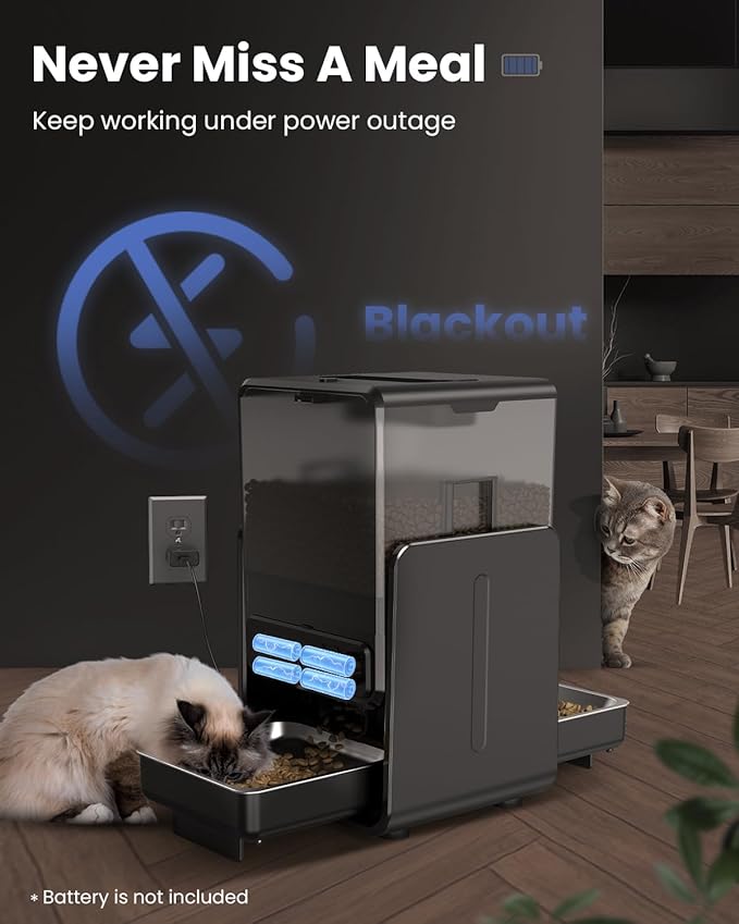- Dual Power for Peace of Mind: Stay worry-free with dual power- adapter and 4 AA non-rechargeable batteries (not included) with automatic switch-over during outages. 45-day battery backup ensures reliability. Record a 10-second custom meal call to comfort your pets and build a stronger bond