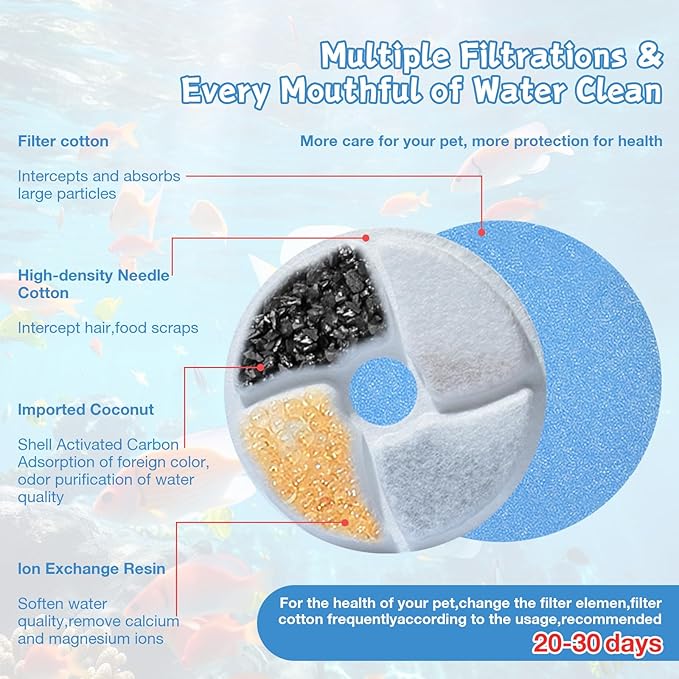 - 【Easy to Clean & Install】- This cat water fountain can be assembled and disassembled in just a few minutes, making maintenance a breeze. Its hassle-free design allows for quick refills and filter changes, it’s recommended to change the filters every 2-4 weeks to maintain your cat’s health. (Please search "B0F6Y7DQZT" to buy the official filters)