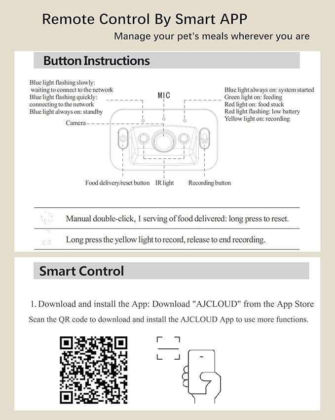- Smart Notifications and Indicators: Your phone gets notifications when the food/ battery level is low, when a blockage occurs, WiFi is disconnected, the feeder stops working or has other problems The infrared sensor keeps checking and stops food dispensing if the food outlet is blocked.