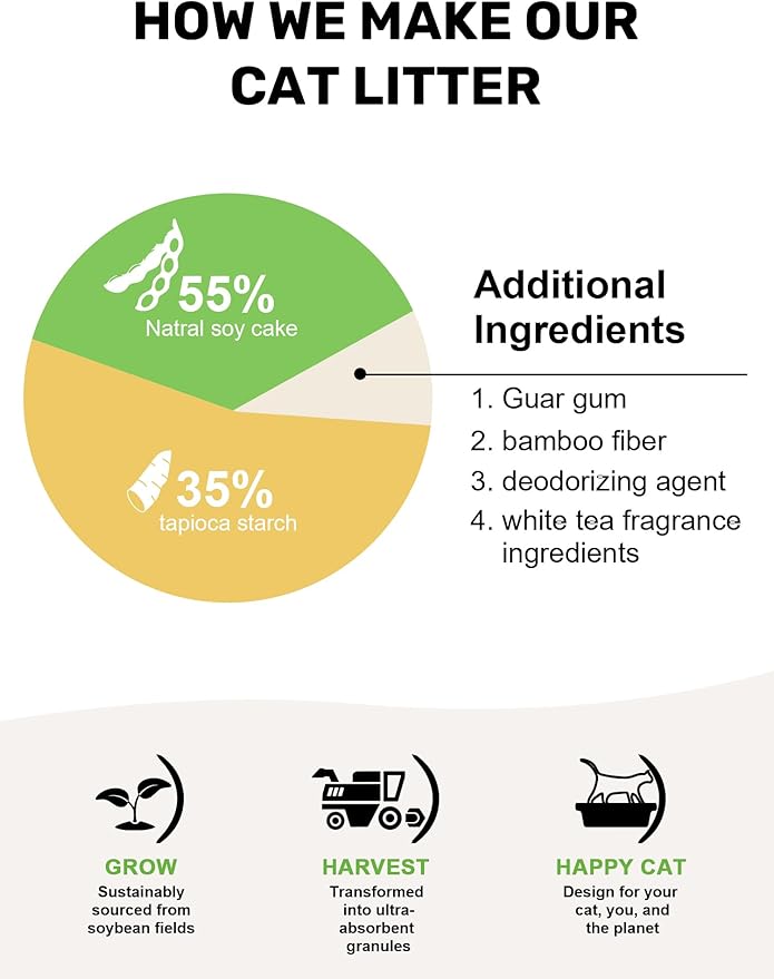 - Advanced Odor Control - Powered by bean-derived enzymes and fibers, this litter targets odors at the source. Ultra-dense clumps (via starch) lock moisture and odors within seconds. Fragrance-free and natural, it neutralizes 99% of smells for lasting freshness.