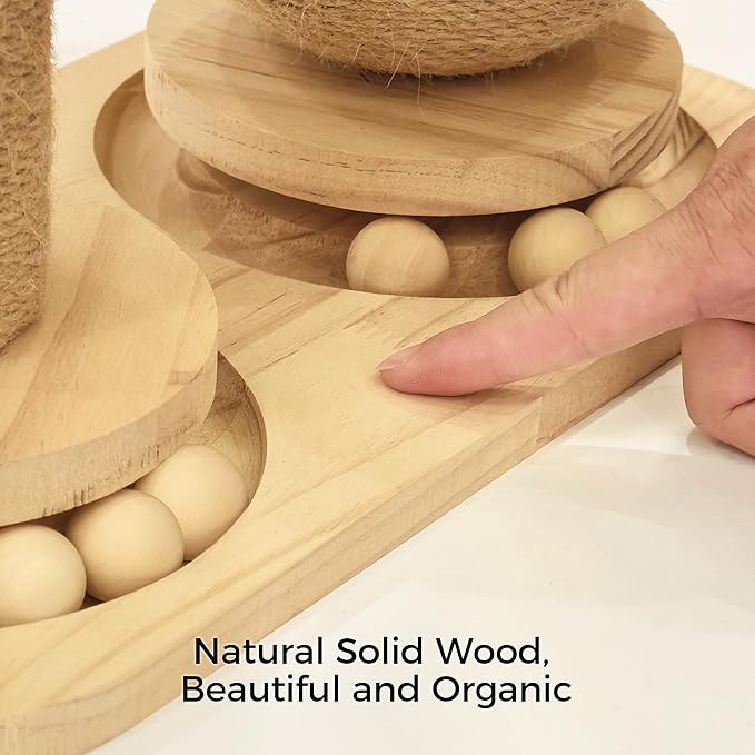 - 3-in-1 Design: The natural woven sisal post is perfect for your cat to scratch; the two solid wood ball tracks stimulate curiosity and satisfy your kitten's natural instincts. The big sisal ball toy and 3 hanging sisal balls provide endless fun and offer multi-level play. This design is suitable for multiple cats to enjoy together.