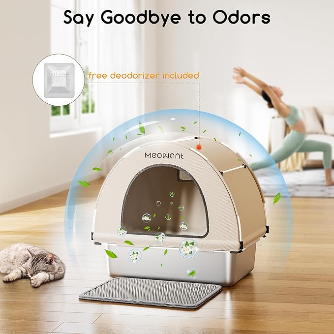 - 85L Large Capacity Cat Litter Box:Meowant enclosed stainless steel litter box provides a spacious area suitable for different cat sizes, space measuring 24.4x15.7x15.1 inches. This multi cat litter box has ample space, enough for an adult cat to use for 30 days. There is also an Eco-friendly oxford fabric tent cover to satisfy your cat's curiosity!