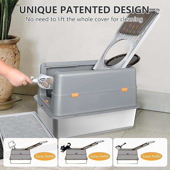 - 【180° flip-top design for easy cleaning】Tired of the hassle of cleaning enclosed cat litter box? Our flip-top stainless steel litter box features a 180° flip-top design. You can easily clean it every day without having to remove the entire top cover. Pair it with the included litter box set for a worry-free daily cleaning experience