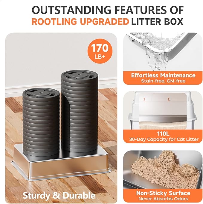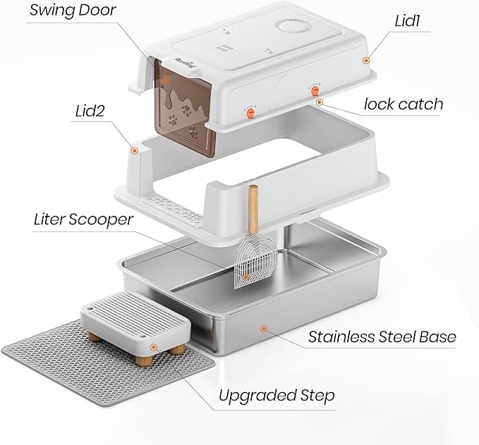 - 【Premium Materials】: The bottom basin of metal litter box is made of sturdy 201 stainless steel, which lasts longer than ordinary plastic cat covered litter boxes, not deform, smooth non-stick surface and easy to clean.ABS material top cover smooth surface, good tactile feeling, toughness, stiffness is better than the common PP material on the market, longer service life.
