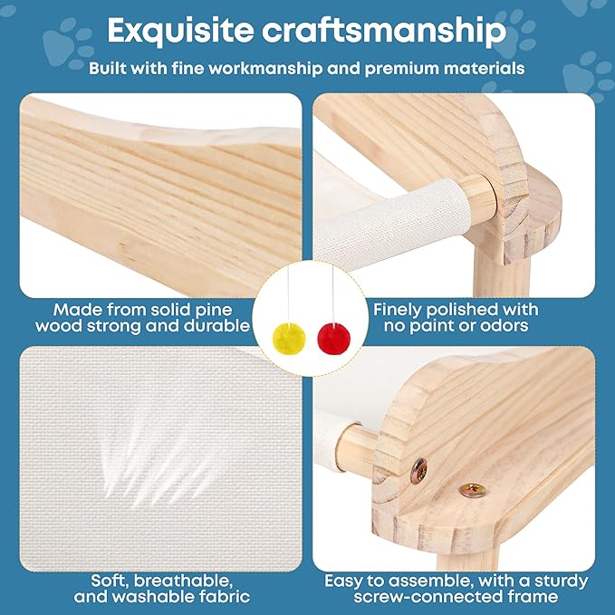 - Natural Pine Wood – Safe & Odor-Free Made of 100% pure pine, this cat bed hammock features a smooth, finely polished surface with no paint or chemicals—safe, eco-friendly, and completely odorless. The natural wood promotes your cat’s health while adding a minimalist charm to your indoor or outdoor cat bed setup