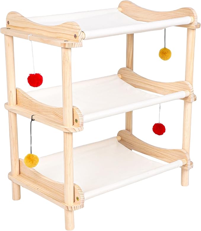 Large 3-Layer Cat Hammock Bed, 24"x15.7"x26.8" Elevated Cat Bed with Pine Wood Frame, Breathable Washable Covers, Wooden Pet Furniture for Indoor Cats and Small Animals(White, 3-Tier)