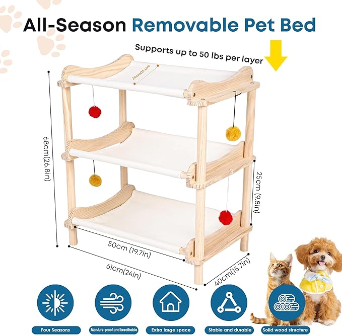 - Strong & Stable – Holds Up to 50 lbs The elevated cat bed is built with a reinforced structure that supports up to 50 lbs per layer. Cats can jump, roll, and stretch freely without wobbling—ideal even as a cat hammock for large cats or a secure elevated dog bed for small breeds