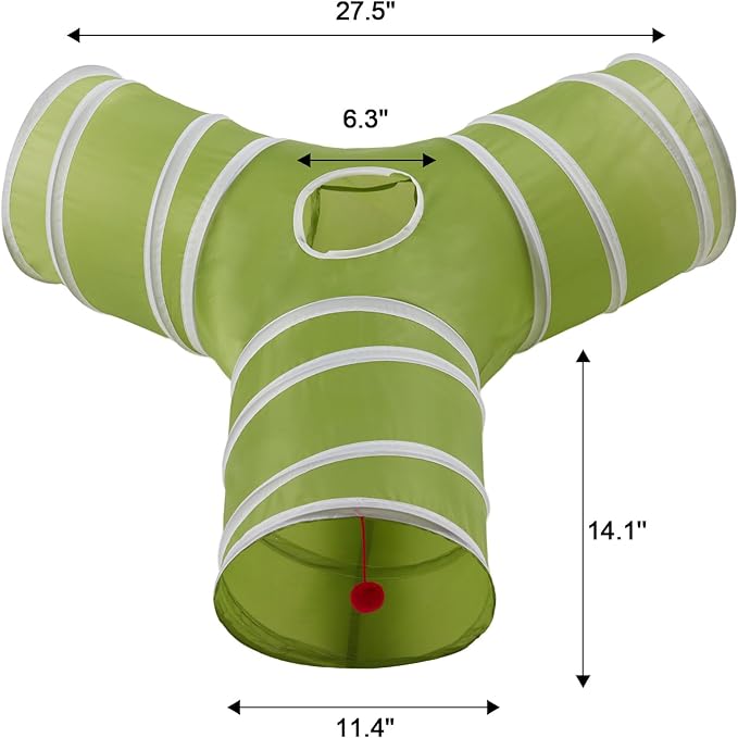 - SIZE AND MATERIAL: The 3 way cat tunnel expands to about 11”(27.94cm) tall x 19” (48.26cm) long and folds down to a fraction of that size.Include 1pcs cat tunnels.This cat tunnel is made of Nylon for indoor cats. Nylon wrapped around a sprung-steel frame.With an interior diameter of 11 inches.