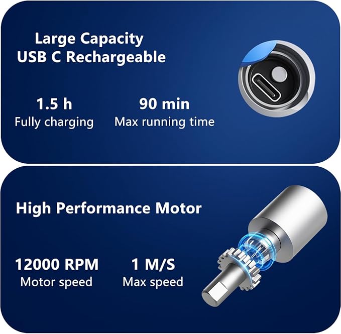 - 【High-performance motor】 Equipped with a high-performance 12,000 RPM motor. The rechargeable battery provides long-lasting playtime