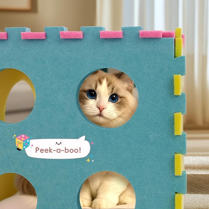 - Which cat wouldn’t love a unique bed? Our colorful cat house features a unique dice shape, making it the perfect addition to any room. Your fur baby can crawl inside and enjoy their own secret hideaway. When they peeks out from one of the openings, it’s sure to become a social media star. Plus, this product can be used as a comfy bed or assembled into a fun tunnel, offering your feline friend multiple ways to play.