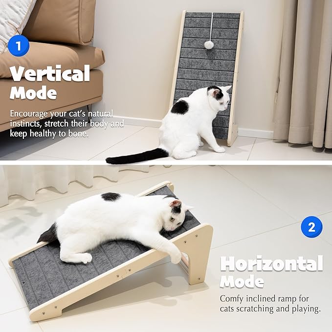 - 2 IN 1 SCRATCHER: 2 ways of placement - Floor mounted ramp or stick against the wall by velcro. Provide a convenient and stable scratching space for cats of all sizes.