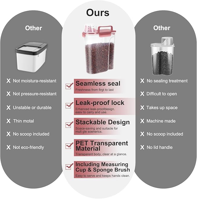 - MULTI-PUrRPOSE STORAGE:Our pet food container is suitable for storing dog food、cat food、bird seed、fish food、rice、 dry food、cereals、oats、cat litter 、flour and other large and small grains, as well as washing powder used at home. It is also a good choice.