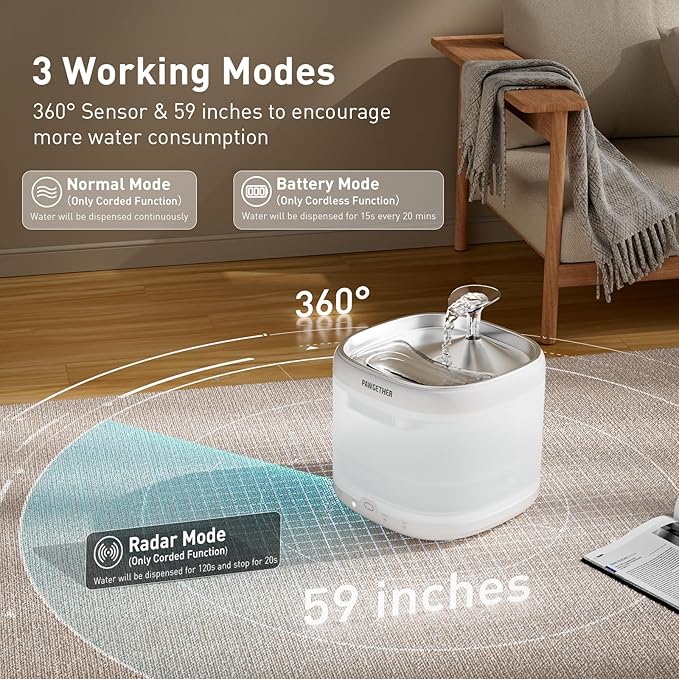 - 【3 Water Working Modes】Pawgether pet water dispenser has three working modes, meeting the needs of your furry friends. (1) In normal mode(Only Corded Function), the water fountain operates continuously. (2) In radar sensor mode(Only Corded Function), water is dispensed for 120s and stops for 20s when pets are detected within a 59-inch range. (3) In battery mode(Only Cordless Function), the water fountain operates for 15 seconds every 20 minutes, battery life can lasts up to 30 days (tested by using Alkaline batteries)