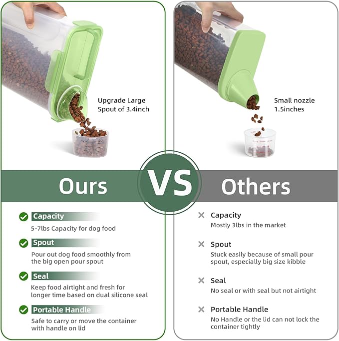 - WHAT YOU GET?:The small dog food bin comes with a 1-pack airtight pet food storage container with a clear measuring cup and an upgraded large spout for easy pouring of pet food at any time. This dog food storage containers can be a gift The perfect gift for any home.