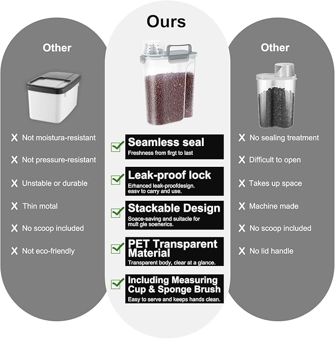 - MULTI-PUrRPOSE STORAGE:Our pet food container is suitable for storing dog food、cat food、bird seed、fish food、rice、 dry food、cereals、oats、cat litter 、flour and other large and small grains, as well as washing powder used at home. It is also a good choice.