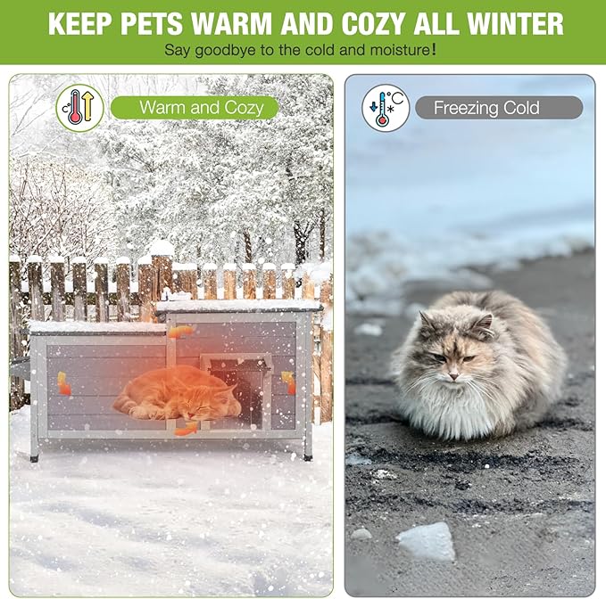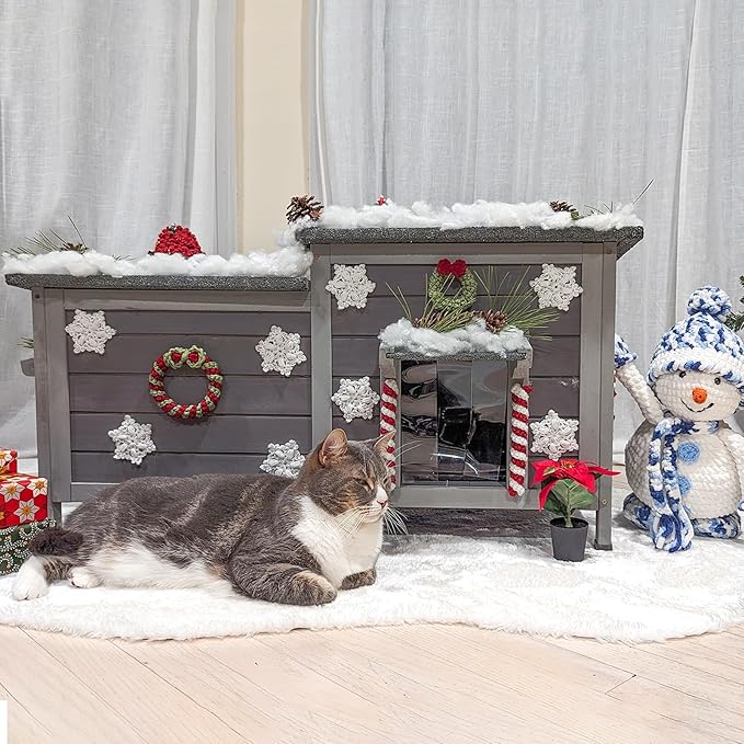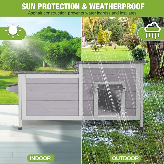 - Sturdy All-Weather Construction: Crafted from natural fir wood with a waterproof protective finish, this cat house features a wide-opening asphalt roof designed to endure diverse weather. The weather-resistant PVC door flaps shield pets from wind and rain, providing reliable outdoor protection.