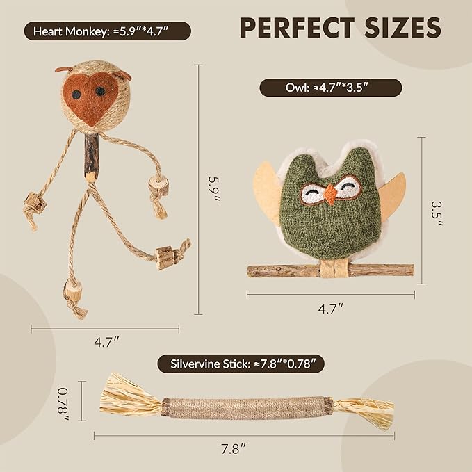 - 【Natural Catnip & Matatabi Chew Sticks】Made with 100% natural materials—silvervine sticks for cats, catnip (included only in the owl toy), sisal rope, and raffia—these interactive cat toys with catnip are safe, eco-friendly, and ideal for cats that love to bite and chew.