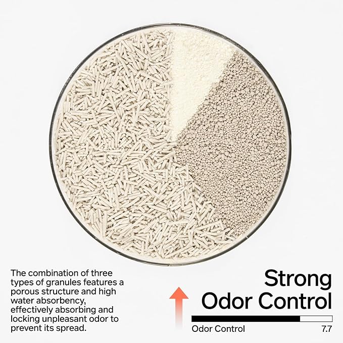 - 【Dusting 1】Resistant to Dusting:The combination of small-particle high-density starch litter, high-hardness tofu litter and similar-sized bentonite clay litter ensures solid clumping and minimizes dust.