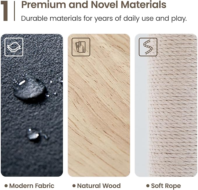 - Premium and Novel Materials: This aesthetic cat tree combines sturdy natural wood for elegance, soft polyester fabric for comfort and easy cleaning, and scratch-resistant cotton rope that is gentle on your cat's claws