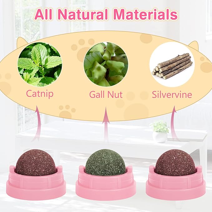 - 【Unique Design of Catnip Toy】The cat toy can easily stick to the wall or other surfaces with strong viscous force, no falling off when your kitten licks and plays. You can give him cat stuff and let him choose his favorite flavor.The catnip treat balls can be rotated 360 degree when licking.