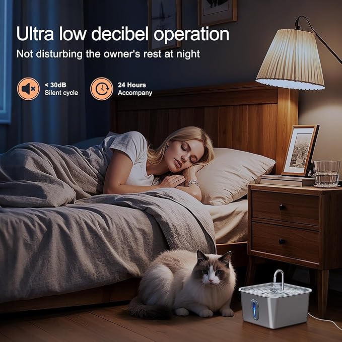 - Ultra-Quiet ≤30 dB Pump:The cat drinking fountain is equipped with a newly developed water pump, which has a running noise of only about 30db, which is very quiet. You don't have to worry about your pet being frightened or the noise affecting its daily habits. In addition, the energy-saving water pump is 5V low pressure, and the water output is stable and splash-free. If you encounter any problems during use, please feel free to contact us, we provide one-year after-sales service