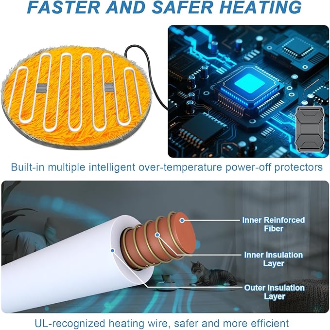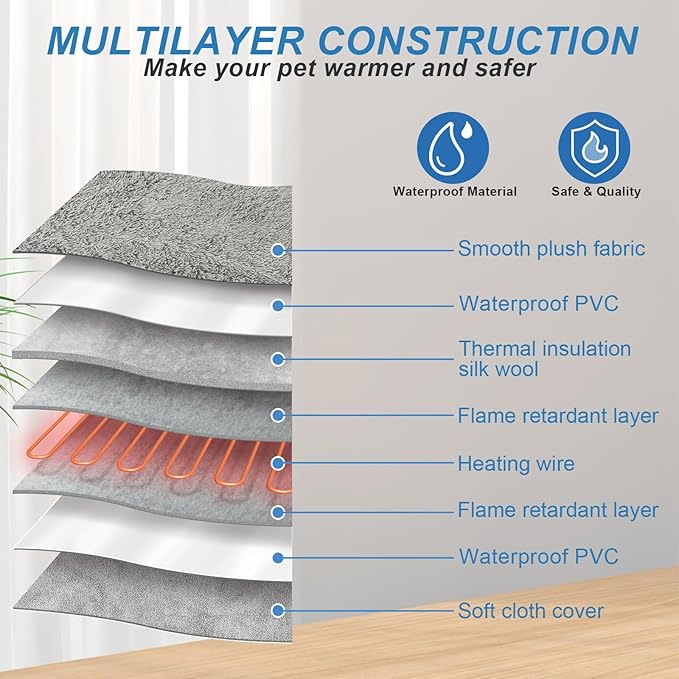 - 【Safety Structure】Our dog heating pad adopts 8 layers of protective structure, double spiral heating wire, which can quickly heat up in about 10 minutes, and the reinforced buckle at the cable connection can prevent damage by pets, no need to worry about leakage. The built-in UL listed heating wire and temperature sensor provide warmth and comfort while effectively preventing burns. The waterproof and flame-retardant inner material adds safety and security, so you can buy with confidence!