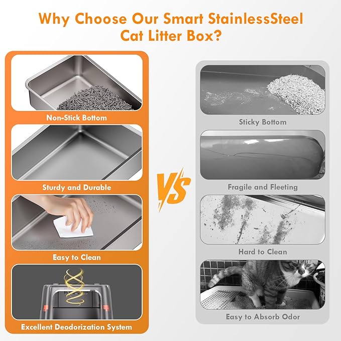 - š¾ Stainless Steel Durability: Made of rust - resistant stainless steel, this litter box lasts 3ā5 years, 5 times longer than plastic ones. Its non - porous, non - stick surface never absorbs odors or stainsājust rinse with water and wipe dry for instant cleanliness. Itās scratch - proof against cat claws, remaining in perfect condition even with daily use.