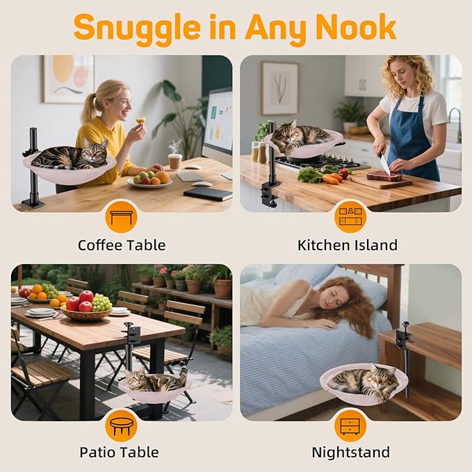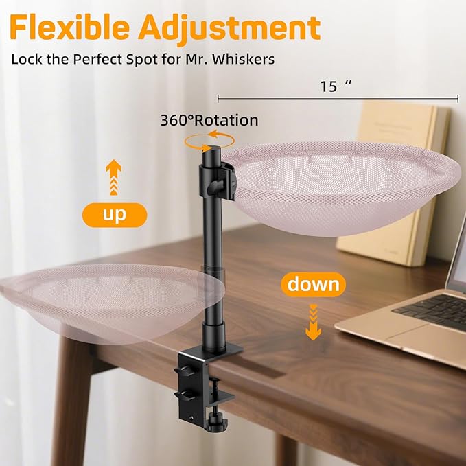 - 【360° Rotating & Height Adjustable】: Give your cat the ultimate vantage point! This ingenious elevated cat desk bed basket spins smoothly a full 360 degrees, letting your curious feline effortlessly survey their entire domain without leaving their cozy perch. Plus, easily adjust the height to find their purr-fect viewing level, whether they want to watch birds outside or keep an eye on you working. Keeps them entertained and close, all while saving precious desk space.