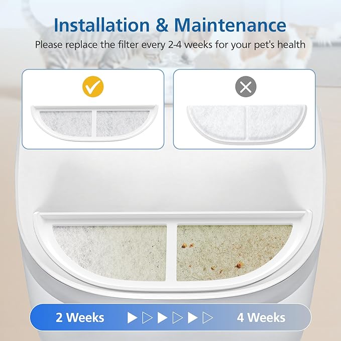 - 【𝐄𝐟𝐟𝐨𝐫𝐭𝐥𝐞𝐬𝐬 𝐑𝐞𝐩𝐥𝐚𝐜𝐞𝐦𝐞𝐧𝐭】 -Simply rinse the dog water fountain filter thoroughly before first use, and replace it every 2–4 weeks to ensure your pet’s health and clean water