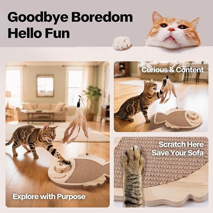 Pawise Cat Scratcher,Fish Shaped Cat Scratcher Toy,Natural Sisal Cat Scratching Board with Feather Teaser and Wooden Roller Ball Toy,Interactive Cat Toy for Indoor Cats,Kittens,+Replacement Feather